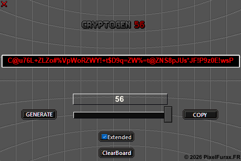 CRYPTOGEN56 is an advanced password generator designed for those who demand absolute security. Thanks to controlled random generation, it produces 56-character passwords with cryptographic entropy exceeding 360 bits. Whether you are a developer, ethical hacker, cybersecurity professional, or simply concerned about your data, this software is your digital safeguard.